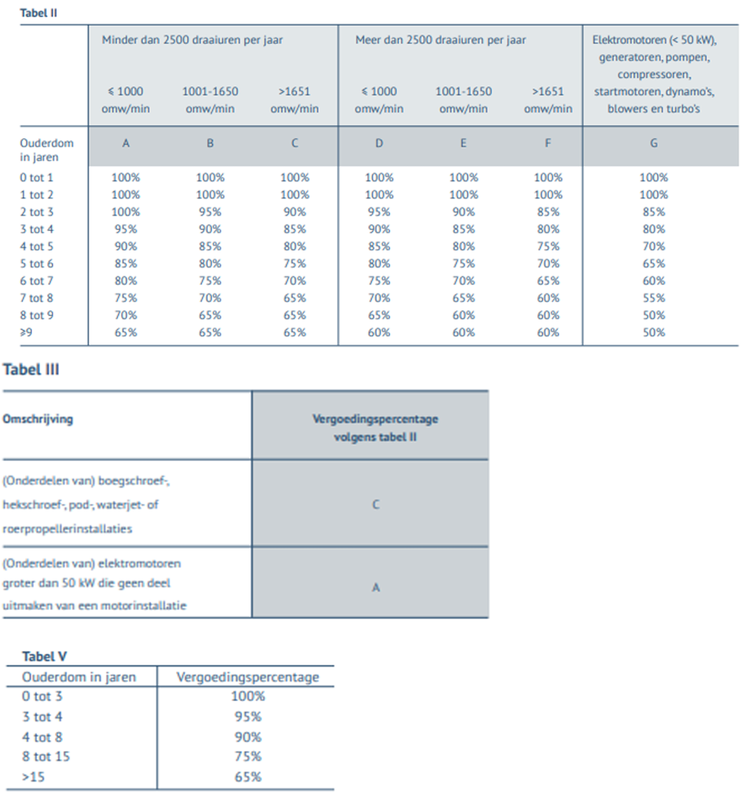 | 4. Erstattungsprozentsätze für (Teile von) Schraubenwellen- und Bugstrahlruderanlagen, Hilfs-Elektromotoren und dergleichen werden abhängig vom Alter nach Tabelle III festgestellt. | 4. Erstattungsprozentsätze für (Teile von) Schraubenwellen- anlagen (ausgenommen Schraubenwellendichtungen) werden abhängig vom Alter nach Tabelle III festgestellt. |