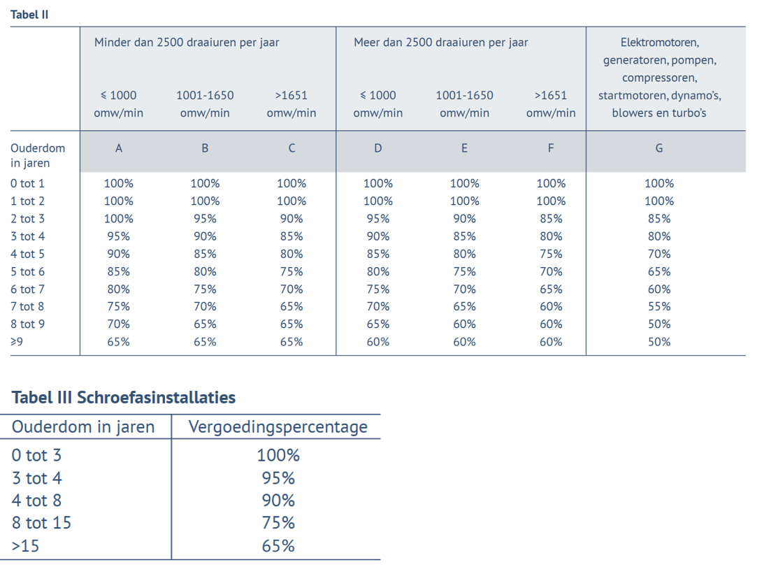 | 3. Erstattungsprozentsätze für Elektromotoren (<50 kW), Generatoren, Pumpen, Kompressoren, Startmotoren, Dynamos, Gebläse und Turbolader werden nach Tabelle II, Spalte G, festgestellt. | 3. Erstattungsprozentsätze für Elektromotoren (die nicht Teil einer Motoranlage sind), Dynamos, Startmotoren, Turbolader, Gebläse, Generatoren, Pumpen und Kompressoren werden nach Tabelle II, Spalte G, festgestellt. |